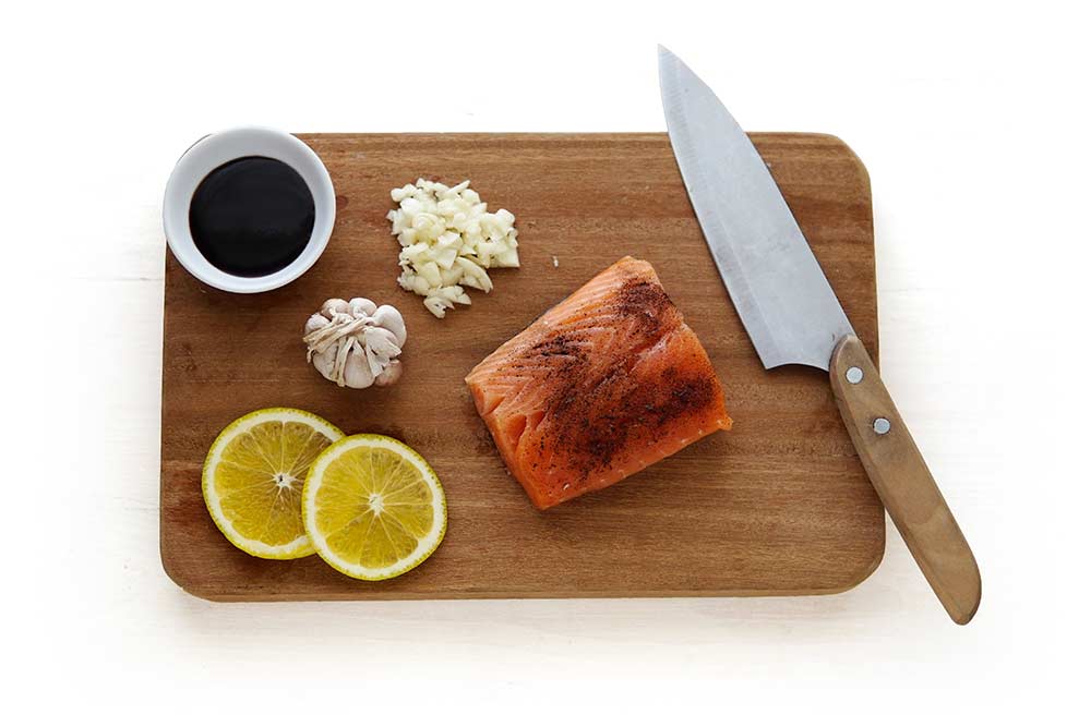 - Rinse salmon under cold water, pat dry with a paper towel, and cut into 4 equal-sized portions.